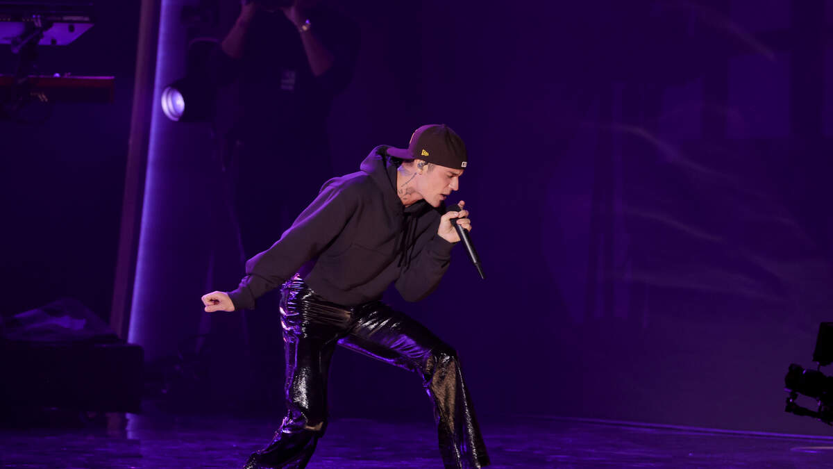 Justin Bieber had everyone talking about his outfit at the Grammys when he pulled up to the red carpet rocking an oversized suit, a pink beanie hat and some black platform Crocs shoes. PHOTO: Getty Images
